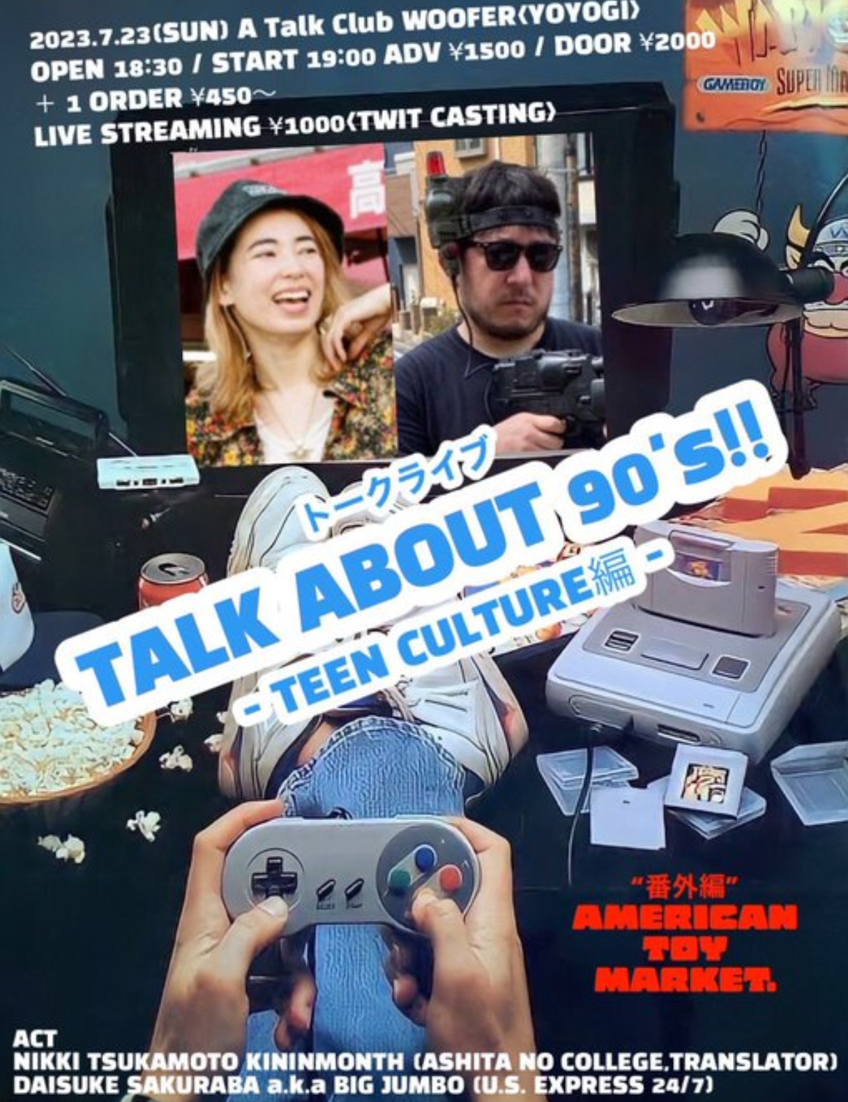 7月末の"AMERICAN TOY MARKET" の告知を兼ねて、 人生初 のトークライブを代々木駅前の"A Talk Club WOOFER (@atcwoofer )" にて開催します!! トークテーマは、 『90年代TEENカルチャーを語りつくそう』です!!